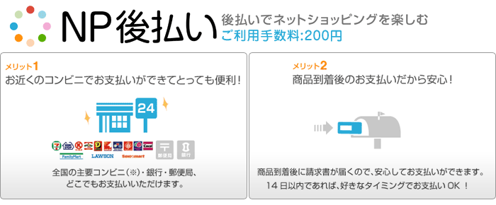 商品の到着を確認してから、「コンビニ」「郵便局」「銀行」で後払いできる安心・簡単な決済方法です。請求書は、商品とは別に郵送されますので、発行から14日以内にお支払いをお願いします。